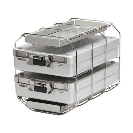 Stelaż D Plus został zaprojektowany z myślą o elastyczności i wygodzie użytkowania. Umożliwia on umieszczenie w komorze sterylizatora do 2 wąskich tac (01310) oraz 2 pojemników MELAstoreBox 200, co pozwala na sterylizację różnego rodzaju narzędzi i materiałów.