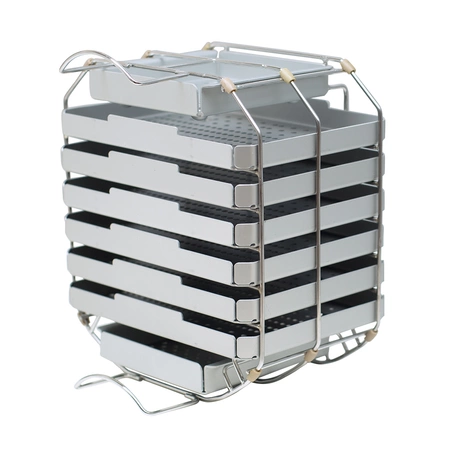 Zoptymalizuj proces sterylizacji w swoim gabinecie dzięki stelażowi 6+2 dedykowanemu do autoklawu Careclave. Ten funkcjonalny stelaż umożliwia jednoczesne umieszczenie 6 krótkich tacek oraz 2 wąskich, krótkich tac, maksymalizując wykorzystanie przestrzeni w komorze sterylizacyjnej.