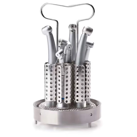 Zapewnij optymalną organizację i efektywność pracy w swoim gabinecie, korzystając z okrągłego stelaża z uniwersalnymi mocowaniami, przeznaczonego do autoklawu i konserwatora końcówek MELAquick 12+ marki MELAG. Ten stelaż umożliwia jednoczesną sterylizację i konserwację aż 7 końcówek stomatologicznych, co znacząco przyspiesza proces przygotowania instrumentów.
